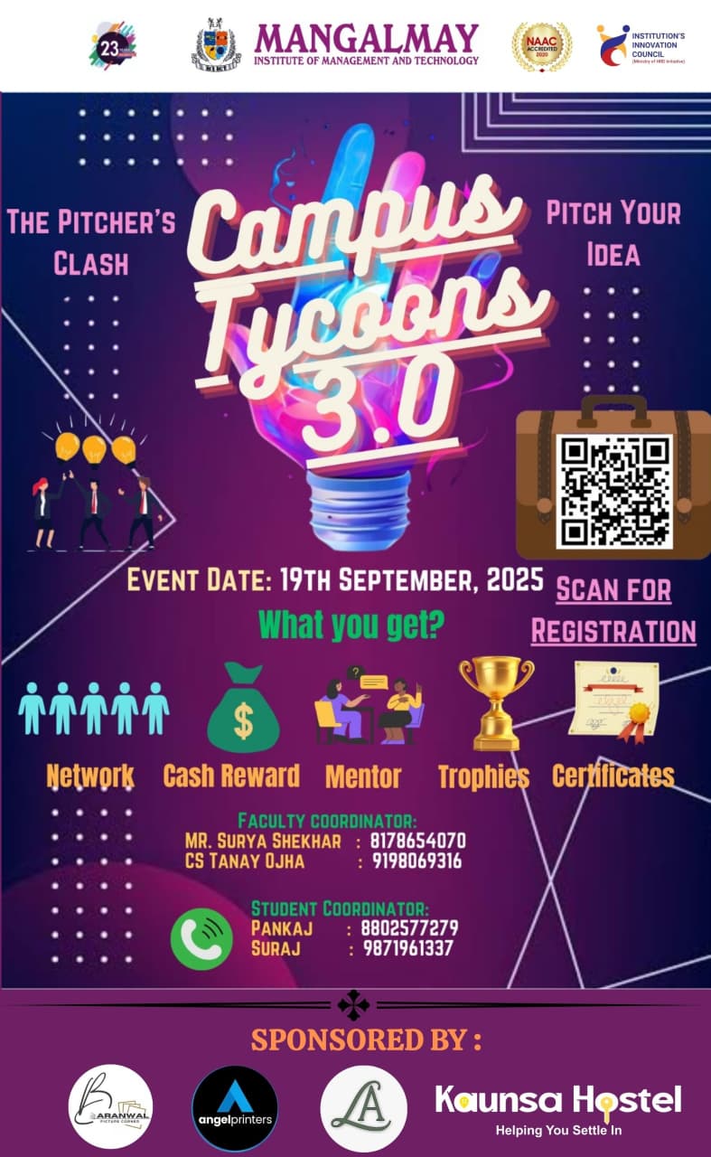 Established in 2002, Mangalmay Institute of Management Technology is one of the premier Institute with a prime focus on innovation, excellence and nurturing global leaders for a sustainable future. We incorporate knowledge, industry experience, research and international exposure in our curriculum so as to provide comprehensive educational program to the students. The Programs offered at Mangalmay are BBA, B.Com, B.Ed, B.A B.Ed & BCA. Institute is affiliated to C.C.S University, Meerut. Its BBA & BCA Programs are approved by AICTE, New Delhi. The Institute is also Accredited by NAAC.